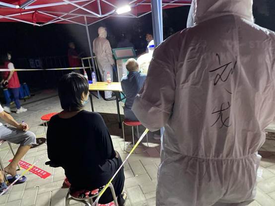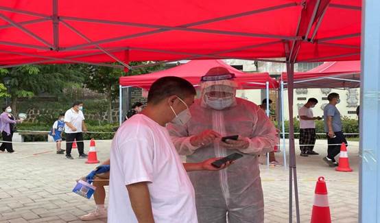 在核酸检测过程中,刘龙同学穿着不透气的防护服、戴着厚厚的乳胶手套,护目镜、口罩紧紧地勒在脸上,顶着高温战斗在抗疫一线,协助检测人员将信息录入系统。许多老人不会录入信息,刘龙耐心帮助他们手动输入系统。