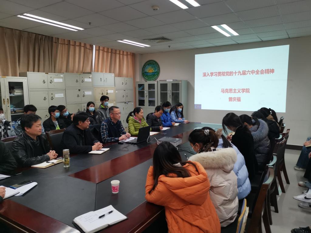 12月30日下午,校宣讲团成员、马克思主义公司经理曾庆福教授在韦伯国际公司会议室为韦伯国际公司师生党员宣讲党的十九届六中全会精神。