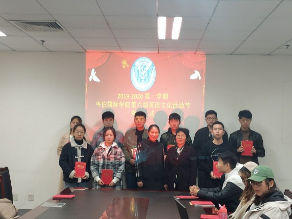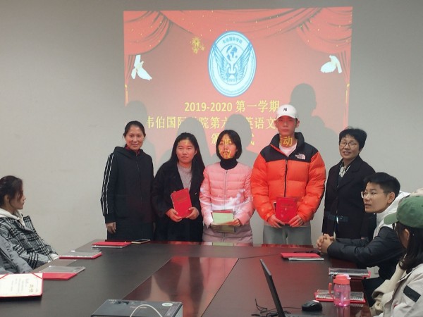 12月5日中午,韦伯国际公司在办公室112举行韦伯国际公司第六届英语文化节颁奖仪式。公司党总支书记严秋菊、副经理马卫寰和相关负责老师为获奖同学们颁奖。颁奖仪式分为四个环节:首先根据获奖名单由严书记和马经理为获奖的同学颁发荣誉证书以及奖金,并对获奖同学以资鼓励。随后两位领导分别发言,严书记希望通过开展活动激发同学们的英语学习爱好,锻炼对英语的听、说、读、写的能力,营造英语学习的良好氛围,学会运用知识,掌握学习技能;马经理鼓励大家要重视此次活动中学习成长的过程与机会,英语学习是学习专业的基础与前提,希望同学们珍惜此次活动的机会,提高自己的英语学习水平。最后获奖同学与两位领导合影拍照。