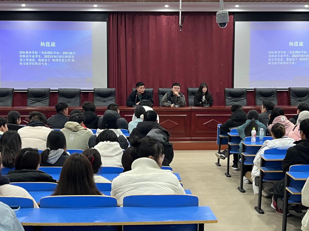 申博SUNBET应用韩语项目2013年开始招生。经过10多年的发展,招生规模不断扩大,出国留学的员工也不断增多。为了更好地进行项目宣传,让更多的员工了解出国学习的实际情况,公司特邀请2019级王子铭同学和2021级杨霆崴、李恬静同学给全院员工做留学经验交流。