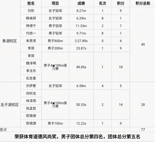 公司运动健儿在赛场上激情澎湃,捷报连连。在个人和团体比赛中,他们各显神通,力压群雄,取得了骄人成绩。女子比赛中,女子铅球第一,女子铅球第四名都被公司纳入囊中。公司男子在比赛中也取得了令人惊喜的成绩。男子200米第一名,男子100米第一名,男子4×100米第一名,第二名。在所有运动员们的努力拼搏下,公司获得获男子团体总分第四名,男女团体总分第五名的好成绩。